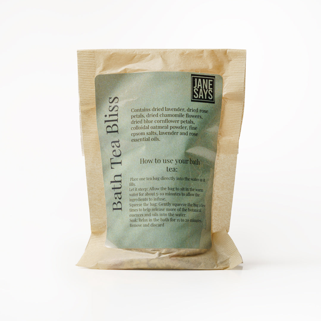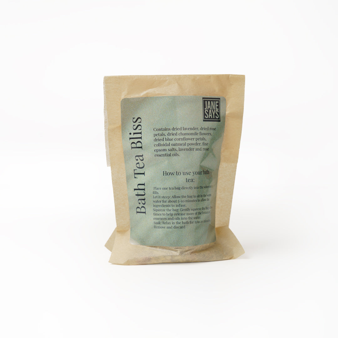 A blend of dried lavender, rose petals, chamomile flowers, blue cornflower petals, powdered colloidal oatmeal, fine ground epsom salts, Lavender and Rose essential oils.